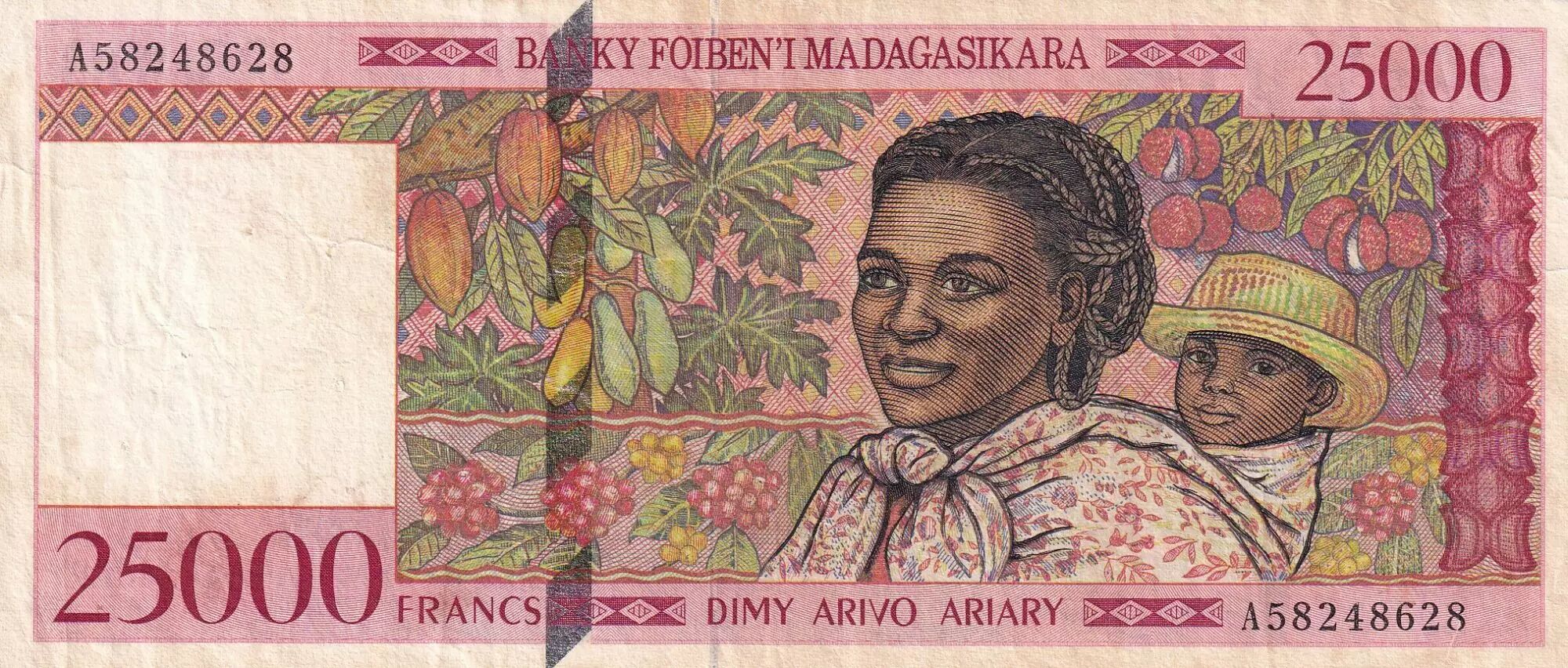 Banknote Madagascar 25000 Francs - Woman and child - Agriculture - ND (1998) - Serial A - P.82