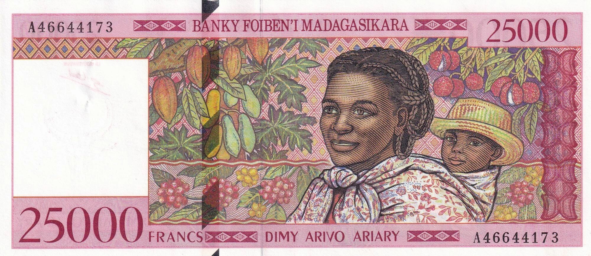 On the obverse, the banknote features a woman carrying a child on her back, a possible symbol of motherhood and Malagasy culture. Various fruits, such as mangoes, papayas and lychees, are also represented, evoking the country's agricultural wealth. The inscriptions are in Latin, with the mention "BANKY FOIBEN'I MADAGASIKARA" (Central Bank of Madagascar) and "DIMY ARIVO ARIARY" (five thousand Ariary), indicating the issuing institution and the value of the banknote. The dimensions of the banknote are 173 mm in length and 76 mm in width.