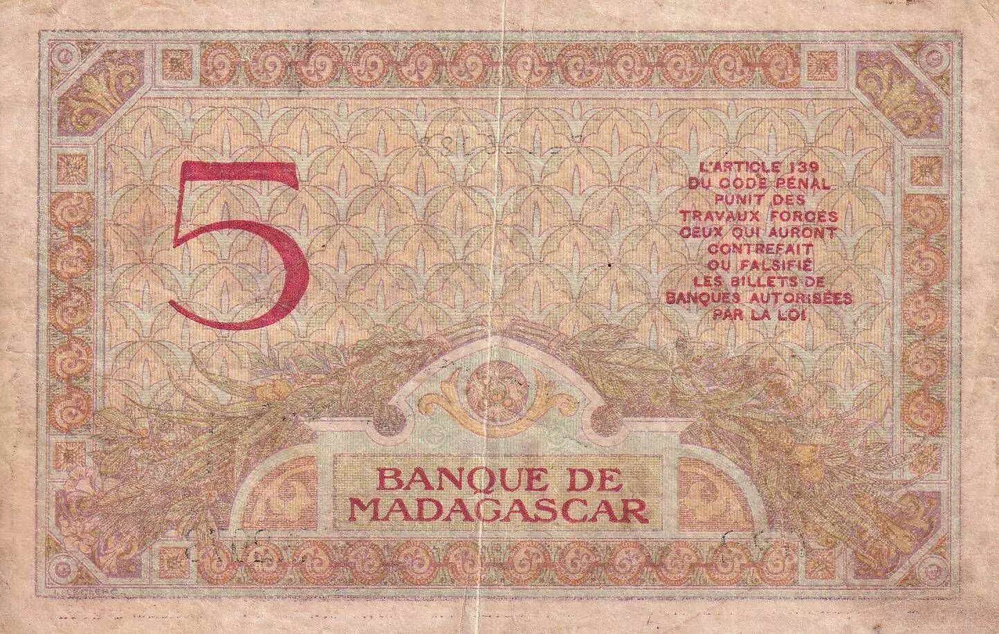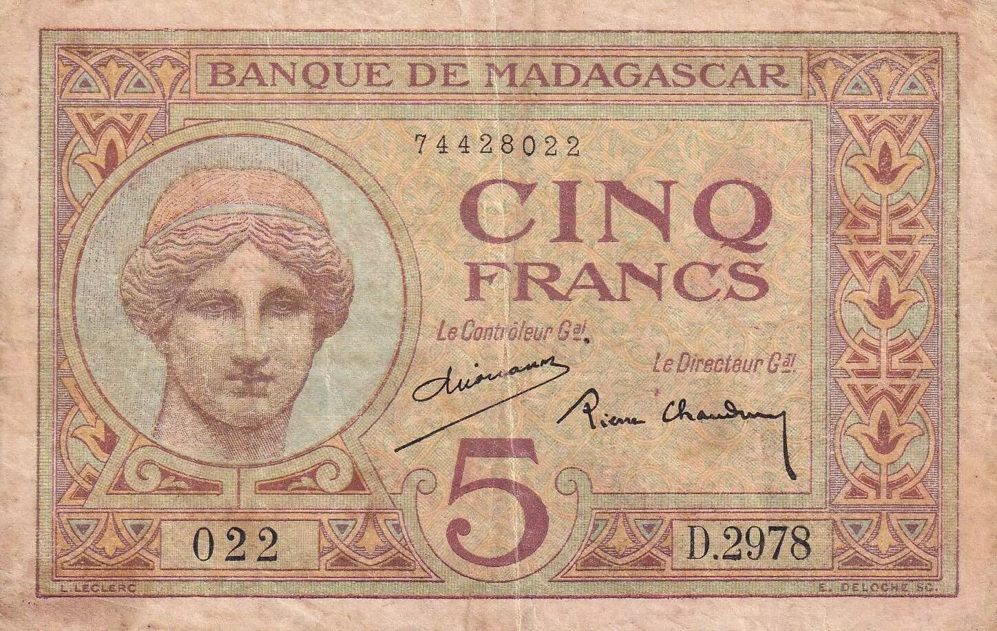 Accueil > Archivage > Madagascar 5 Francs - Déesse Junon - 1937 - Sign. Chaudun - Série D.2978 - TB+ - P.35