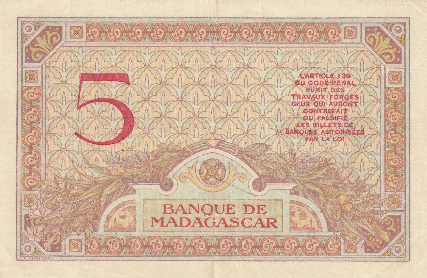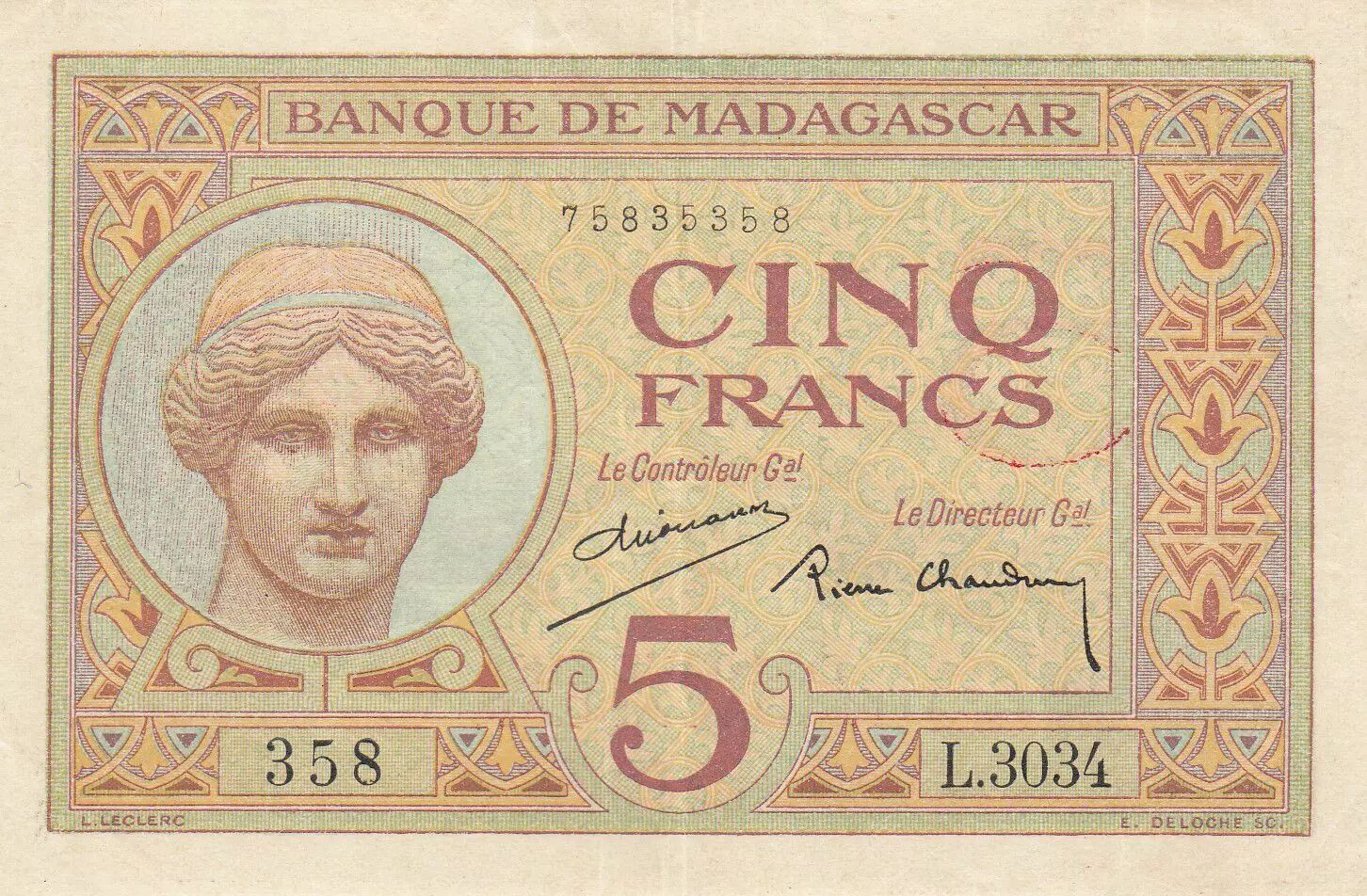 Billet Madagascar 5 Francs Déesse Junon - 1937 - Sign. Chaudun - Série L.3034