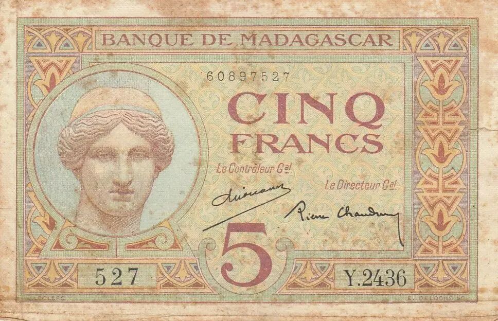 Accueil > Archivage > archivage-Billets du Monde > Madagascar 5 Francs - Déesse Junon - 1937 - Sign. Chaudun - Série Y.2436