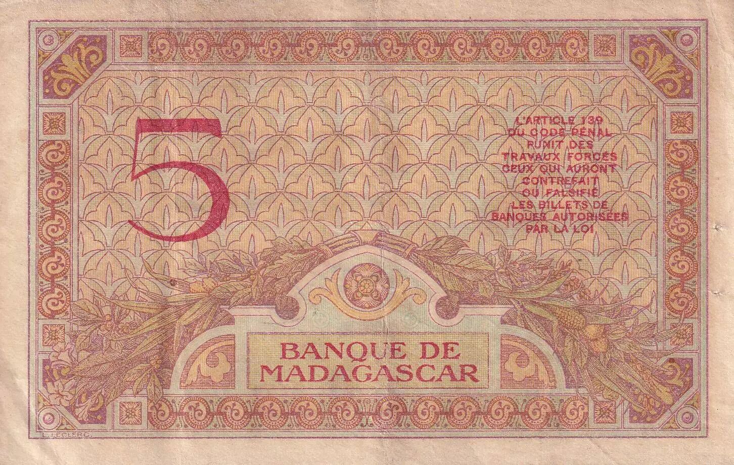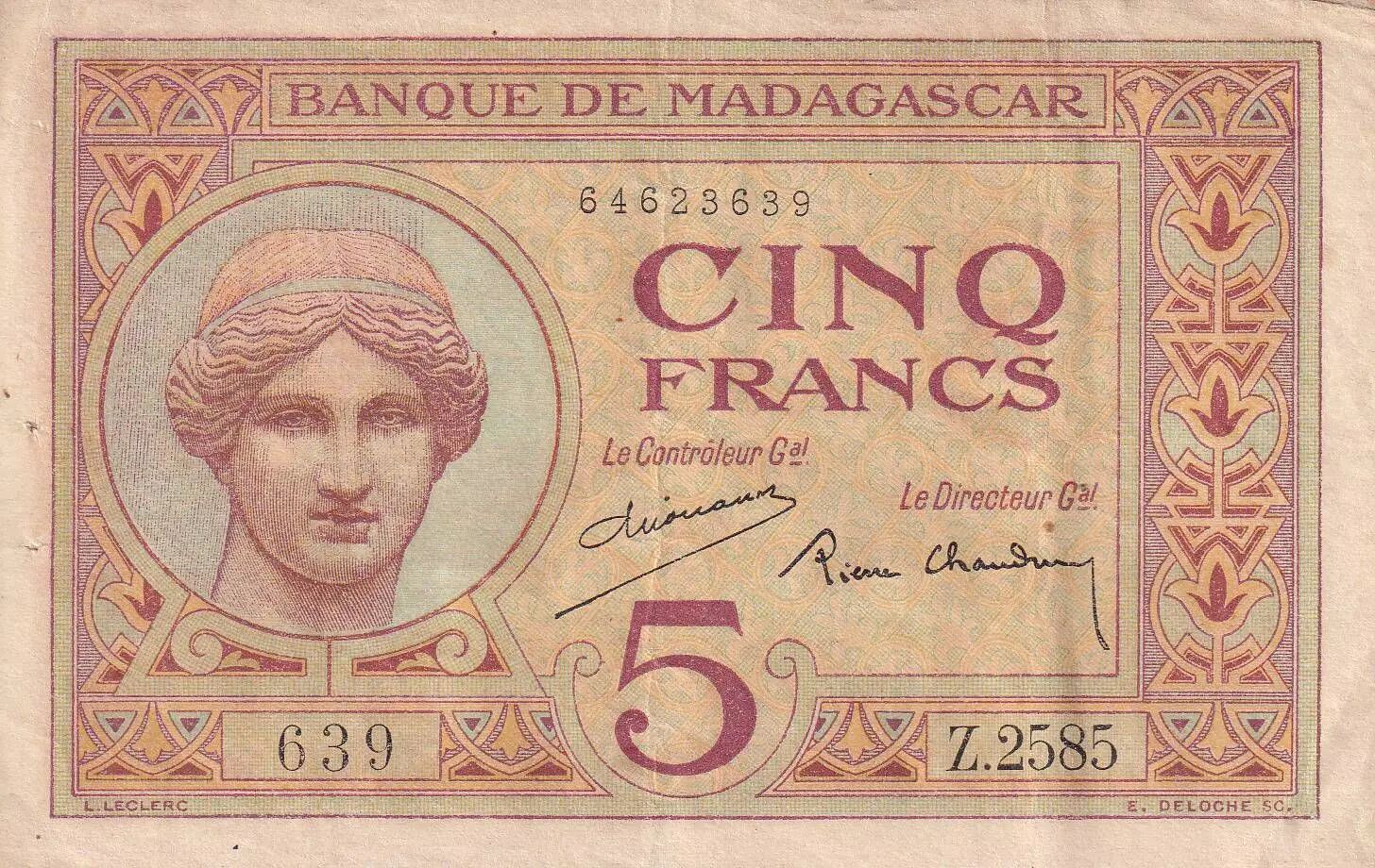 Accueil > Archivage > Madagascar 5 Francs - Déesse Junon - 1937 - Sign. Chaudun - Série Z.2585 - TTB - P.35