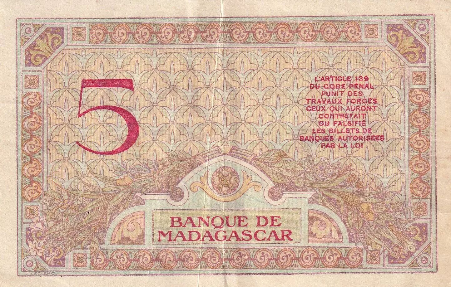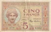 Billet Madagascar 5 Francs - Déesse Junon - ND (1937) - Sign. Chaudun - Série B.3042 - P.35