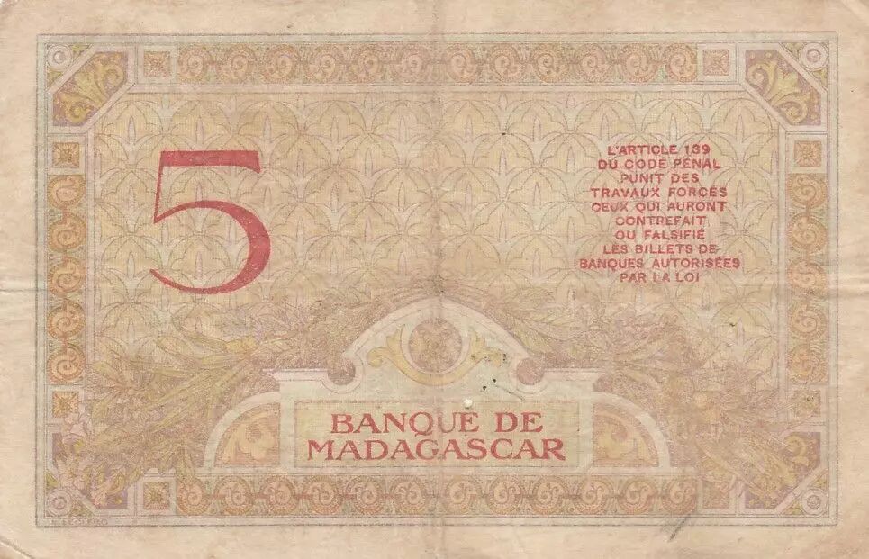 Banknote Madagascar 5 Francs - Goddess Juno - 1937 - Sign. Chaudun - Série M.3194