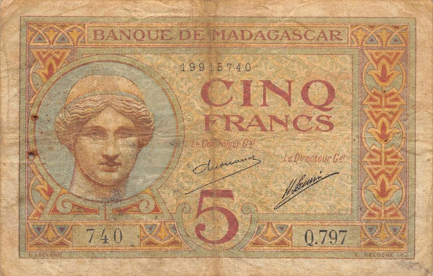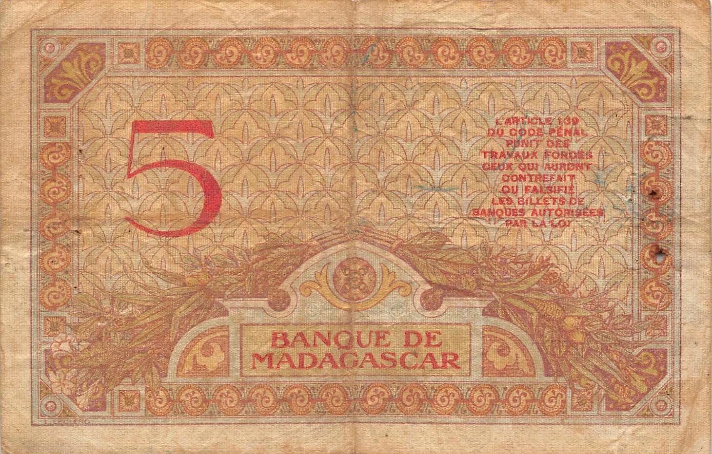 Home > World Banknotes > African Banknotes > Madagascar > Madagascar 5 Francs - ND (1926-1937) - P.35a