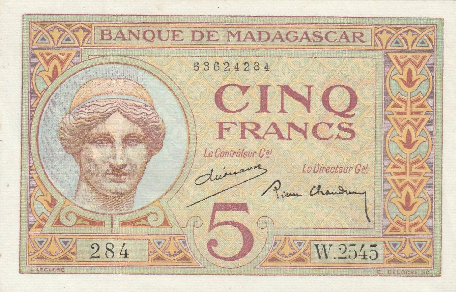 Le billet de 5 francs de Madagascar, émis entre 1937 et 1947, présente un ensemble de caractéristiques distinctives.