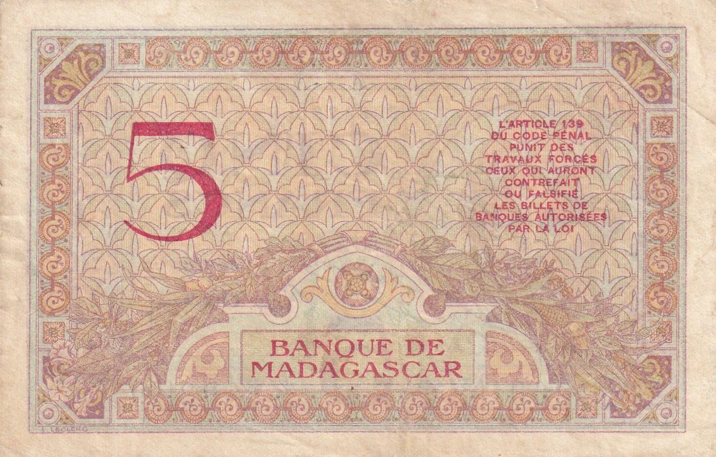 This Madagascar banknote, with a face value of 5 francs, was issued between 1926 and 1947. It belongs to the P.3199 series.