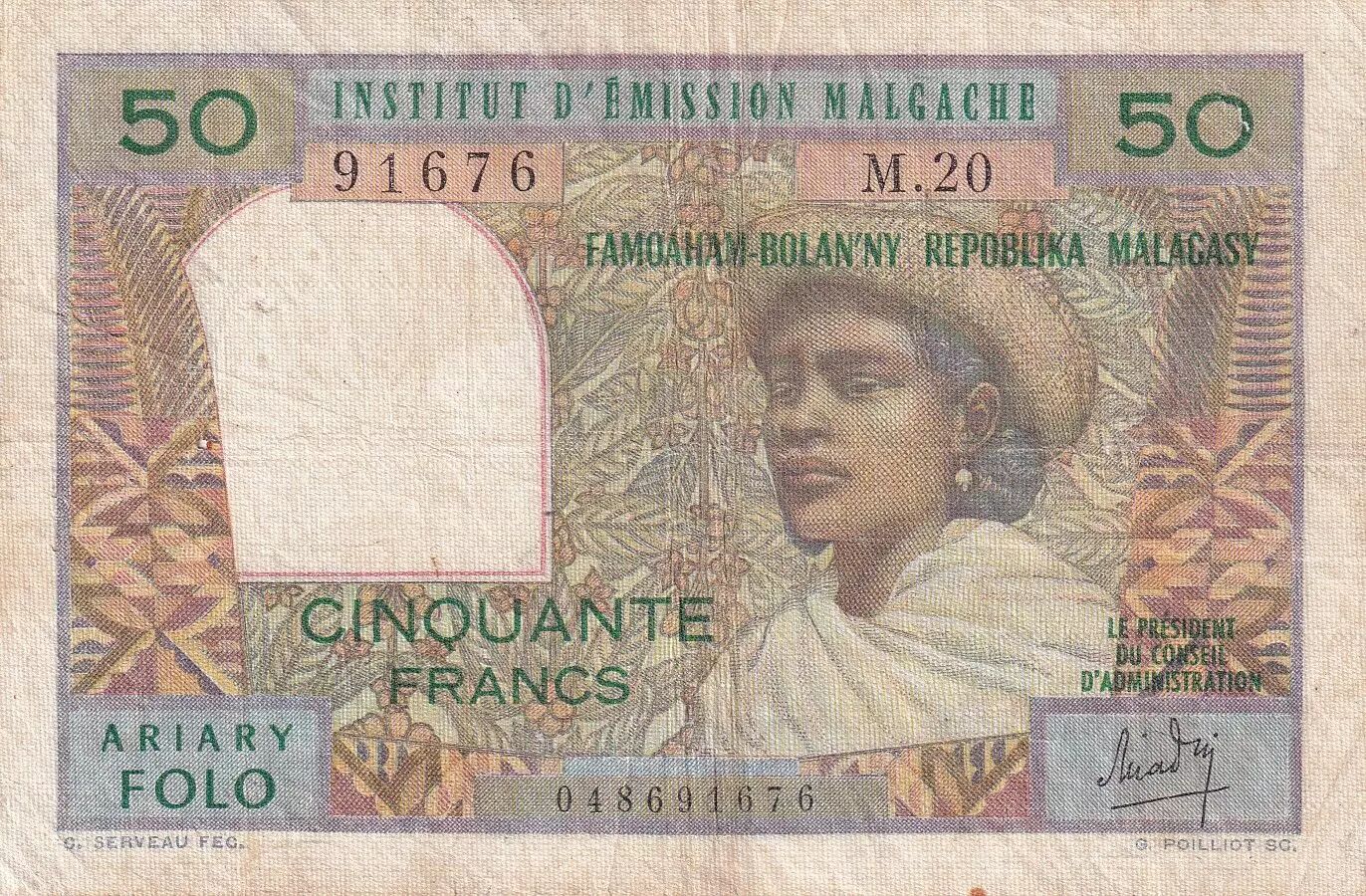 Billet Madagascar 50 Francs - Femme à chapeau - ND (1969) - Série M.20 - P.61