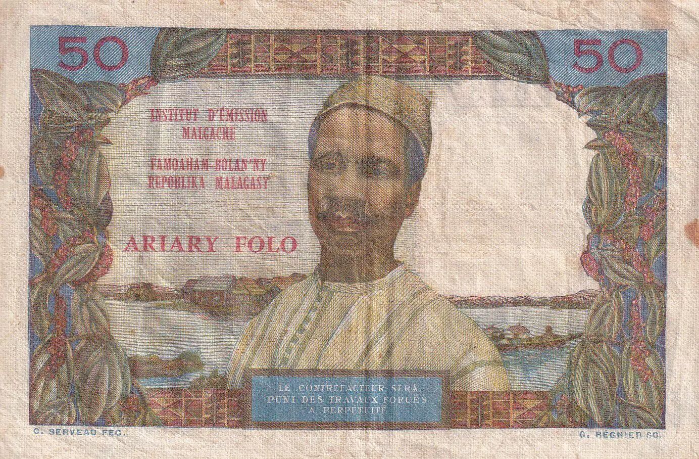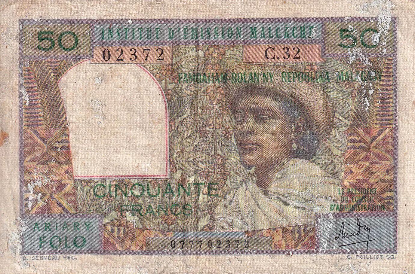 Banknote Madagascar 50 Francs - Woman and Hat - ND (1969) - Serial C.32 - P.61