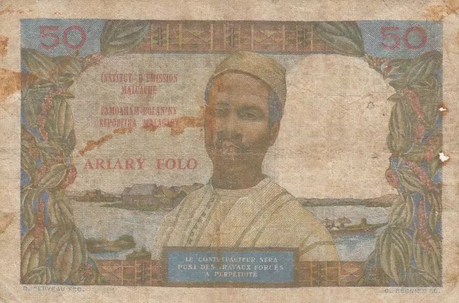 Banknote Madagascar 50 francs - Woman with hat - Ariary Folo - Serial A.10 - 1969