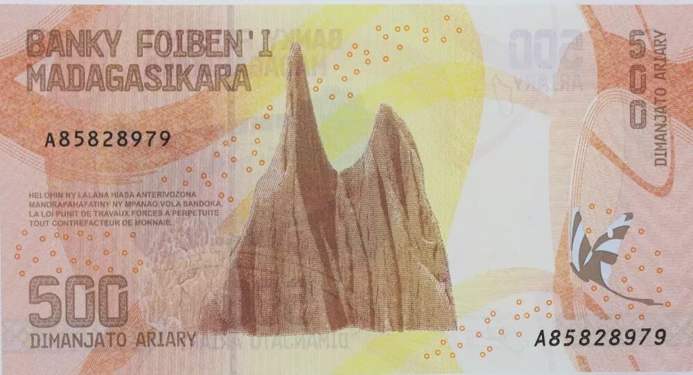 Le verso du billet poursuit la thématique culturelle avec une autre représentation liée à Madagascar. L'iconographie sélectionnée pour le verso complète le message véhiculé par le recto, renforçant ainsi l'identité nationale et la richesse du patrimoine malgache. Les couleurs et les motifs employés sur le verso s'harmonisent avec ceux du recto, créant une continuité visuelle et esthétique. En plus de la représentation visuelle, le verso inclut des éléments de sécurité destinés à prévenir la contrefaçon, tels que des filigranes, des micro-impressions et des encres spéciales. La valeur nominale est également répétée au verso.