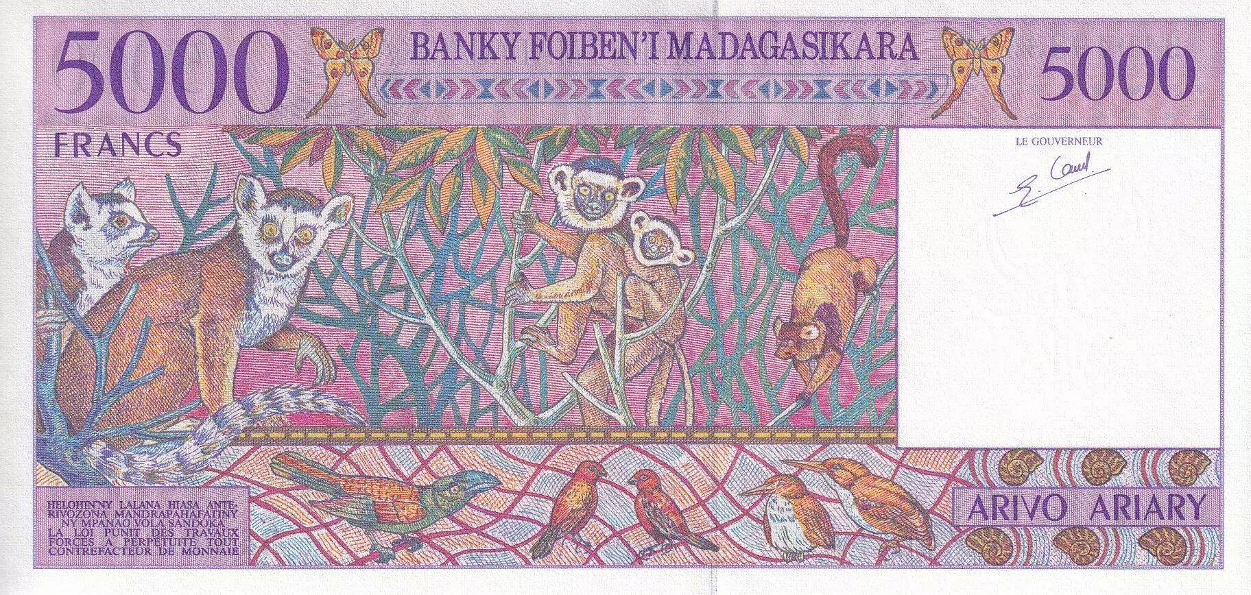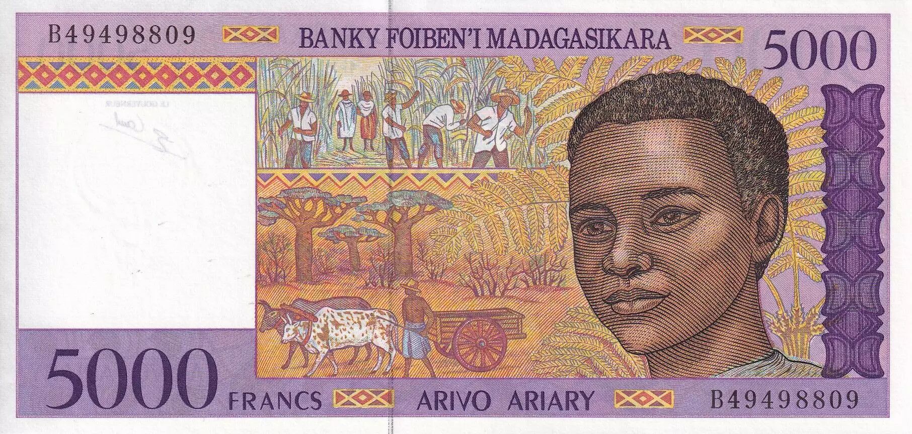 Banknote Madagascar 5000 Francs - Agriculture - Animals - ND (1995) - Serial B - P.78b