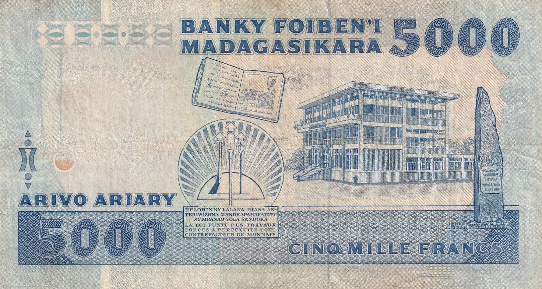 Le verso du billet met en scène la Bibliothèque nationale de Madagascar. On y voit également la stèle de l'indépendance, monument situé dans le quartier d'Antaninarenina à Antananarivo, la capitale du pays. Les textes sont également en écriture latine.