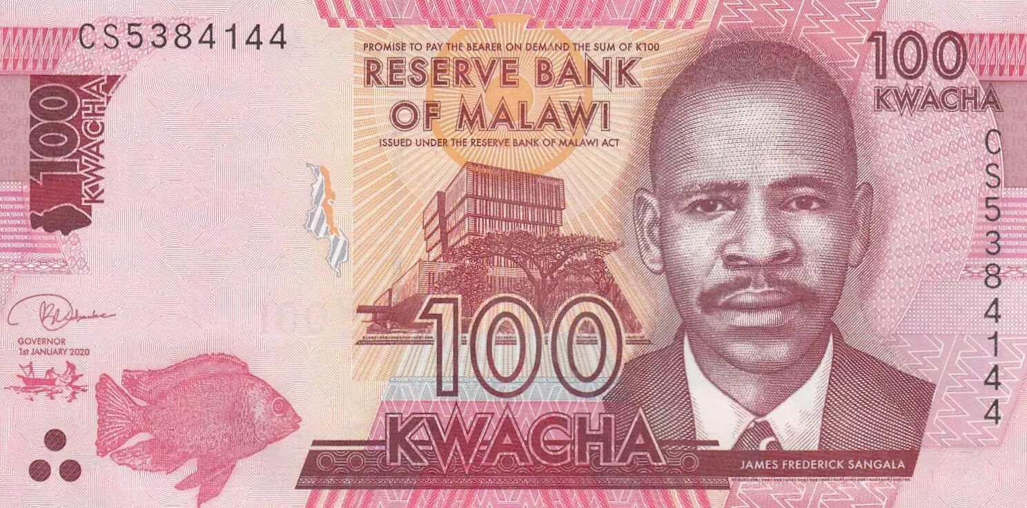The 100 Malawi kwacha banknote, issued in 2020, pays tribute to James Frederick Sangala, a prominent figure in the country's history. This banknote is part of the CS Series and is referenced as P.65 in numismatic catalogs.
