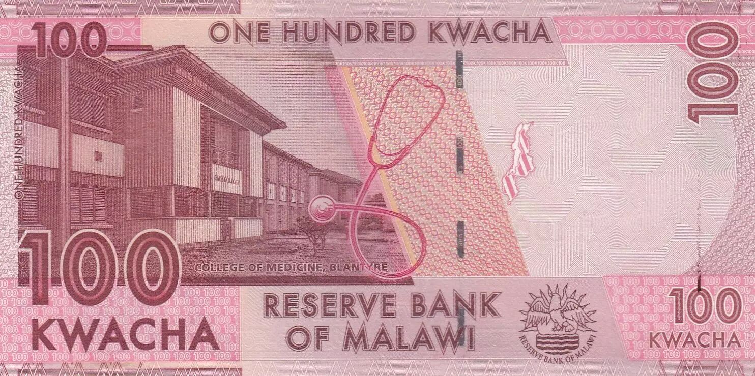 The back of the banknote highlights the College of Medicine in Blantyre. A stethoscope, a symbol of medical training and health services, is also present. The logo of the Reserve Bank of Malawi is included.