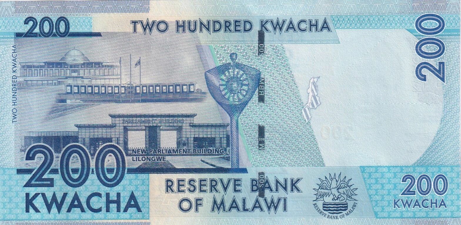 Au verso, le billet représente le nouveau bâtiment du Parlement à Lilongwe, accompagné du nom de la Banque de réserve du Malawi.