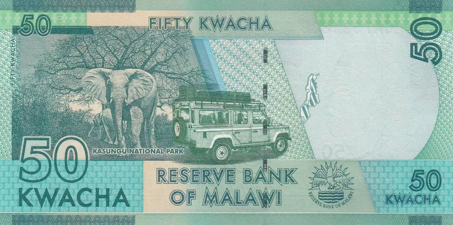 Le verso du billet met en scène des éléphants évoluant dans leur habitat naturel, avec un arbre et un véhicule de safari présents dans le parc national de Kasungu. Le filigrane intégré représente Inkosi Ya Makhosi Philip Gomani II, accompagné de la valeur nominale du billet.