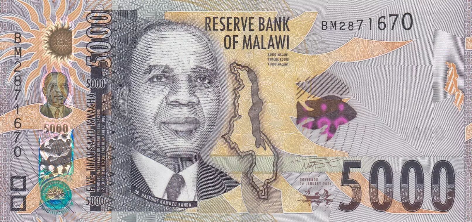 Le billet de 5000 kwacha du Malawi, émis entre 2024 et 2025, présente sur son recto le portrait du Dr Hastings Kamuzu Banda, figure marquante de l'histoire du pays. À droite de ce portrait, une silhouette de la carte du Malawi est visible, accompagnée d'une représentation d'un poisson. Les inscriptions en alphabet latin incluent la mention "Reserve Bank of Malawi" ainsi que la valeur nominale "5000 Five Thousand Kwacha", répétée à plusieurs endroits du billet.