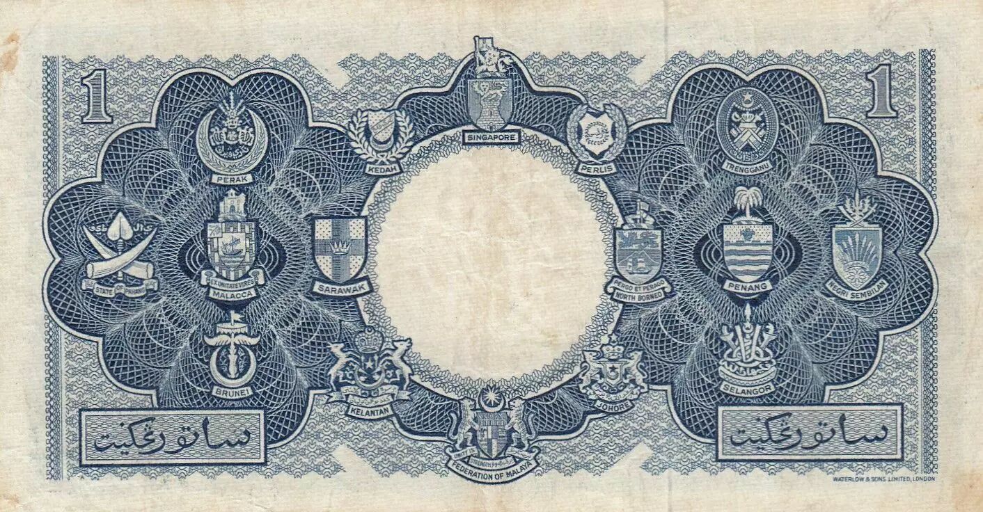 Le revers du billet arbore les armoiries combinées de plusieurs États et entités géographiques. Ces armoiries représentent Singapour, Perak, Kedah, Pahang, Malacca, Sarawak, Brunei, Kelantan, Perlis, Trengganu, North Borneo, Penang, Negri Sembilan, Johore, Selangor et la Fédération de Malaya. L'ensemble de ces blasons témoigne de la diversité des territoires et des protectorats inclus dans la fédération de Malaya à cette époque. Ces symboles héraldiques sont disposés de manière à créer une composition visuellement riche, reflétant la complexité politique et administrative de la région.