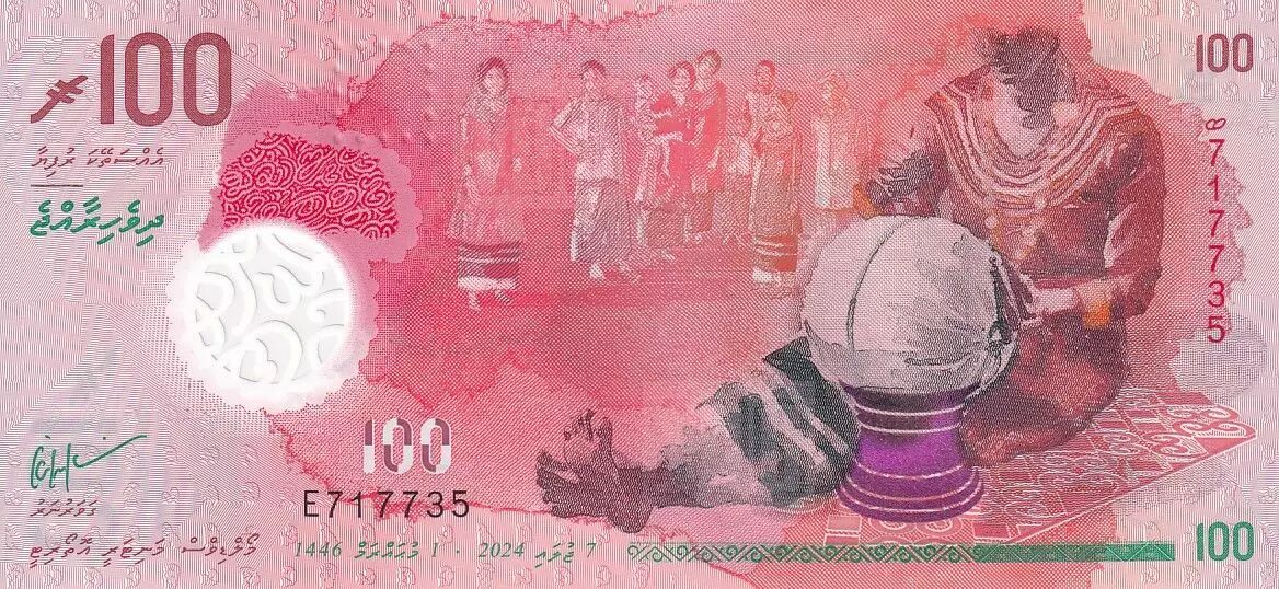 Home > World Banknotes > Asian Banknotes > Maldives > Maldives 100 Rufiyaa, Braiding woman - Local crafts - Polymer 2024