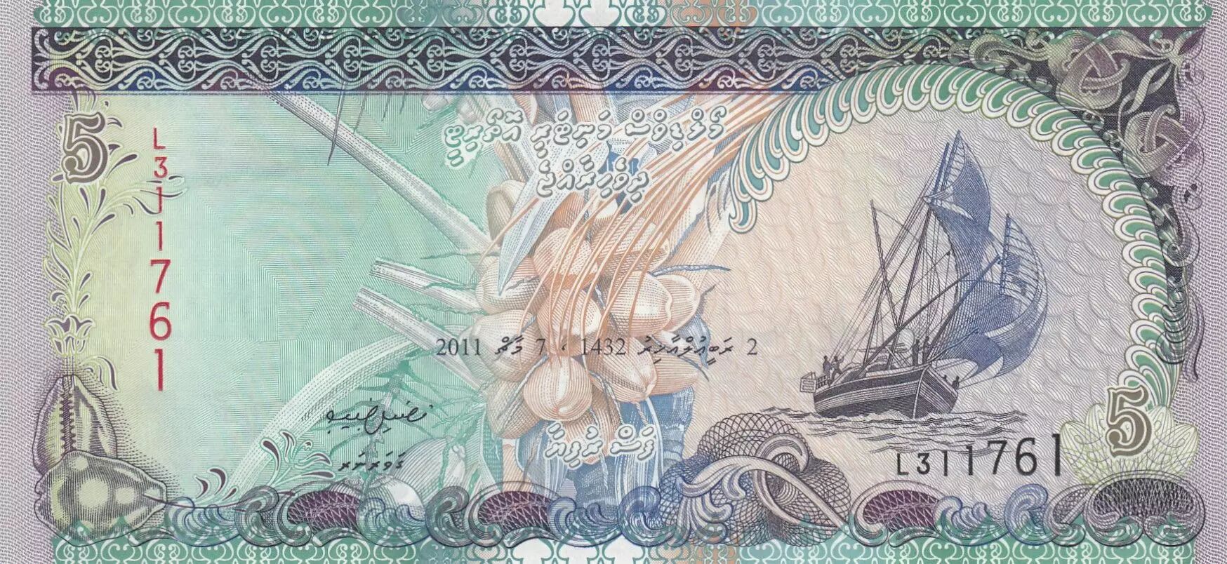 Billet Maldives 5 Rufiyaa - Dhaw - Bateaux de pêche - 2011
