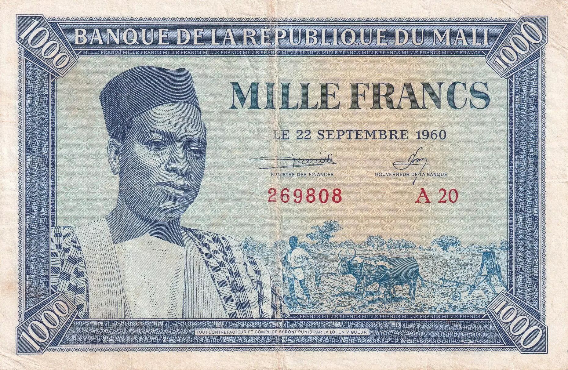 Banknote Mali 100 Francs - Pres. Modibo Keita - Farmers ploughing - 1960 - Serial A 20