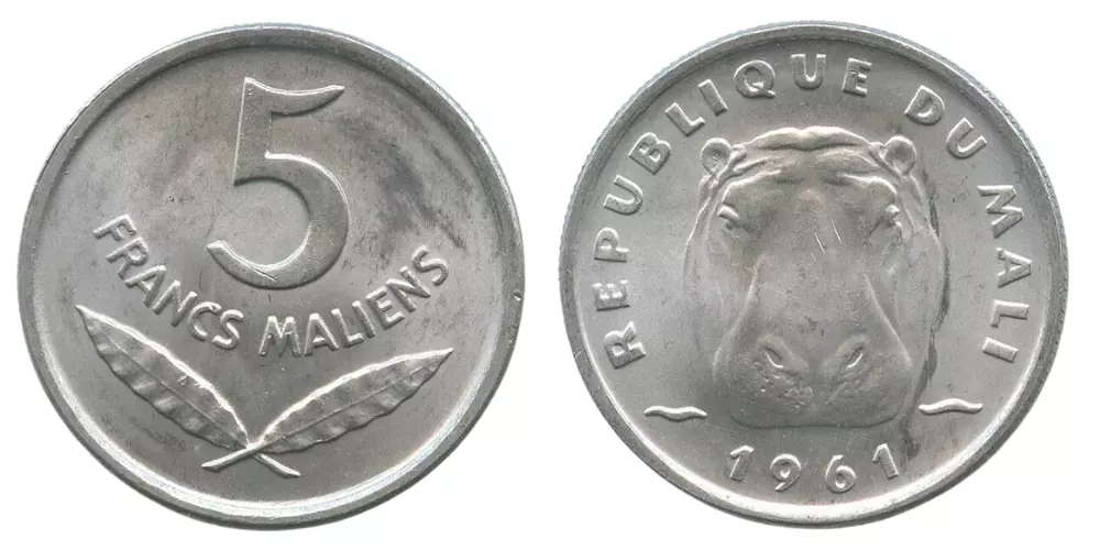 Home > World Coins > African Coins > Mali > Mali 5 Malian Francs - Hippopotamus - 1961