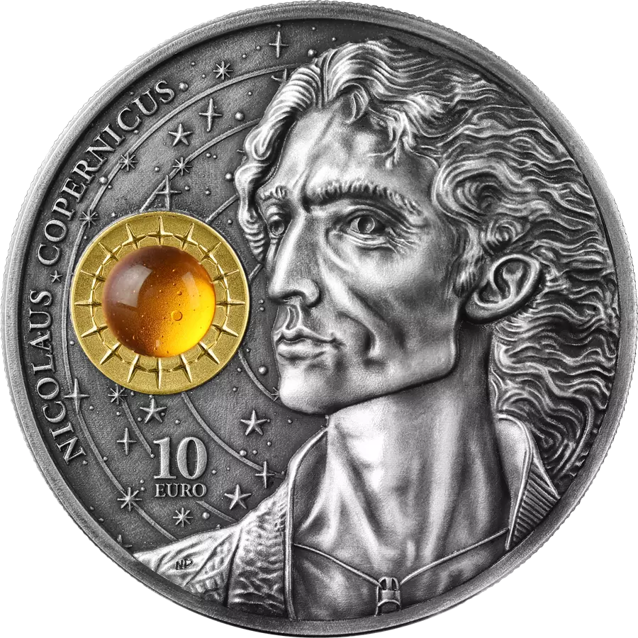 The obverse of the coin bearing the effigy of Copernicus is embellished with an amber sun. The reverse depicts a 16th-century solar system. The coin, designed by Natalia Danysz, will be available in a unique packaging, in an edition of 1,473 numbered pieces.