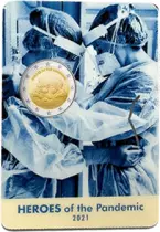Cette pièce commémorative de 2 euros, émise par Malte en 2021, rend hommage aux héros de la pandémie de COVID-19. Frappée en qualité Brillant Universel (BU), elle est présentée sous coincard.