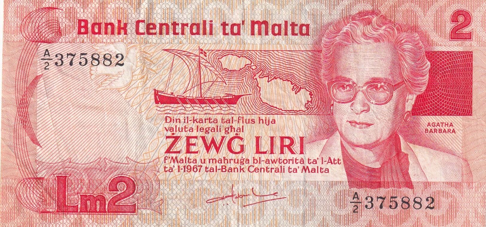 La désignation "Agatha Barbara - Port" suggère que le billet peut comporter un portrait d'Agatha Barbara, une personnalité notable de Malte, et/ou une représentation du port, un élément important de l'économie et de l'histoire de l'île. La série A.2 indique une version ou une édition spécifique de ce billet, potentiellement différenciée par des caractéristiques de conception ou de sécurité.