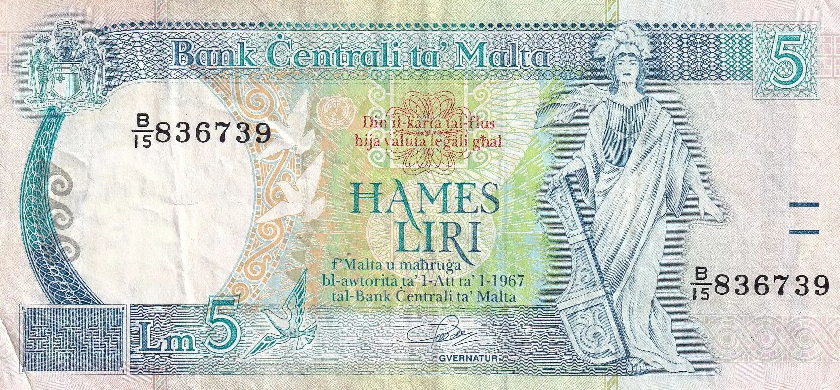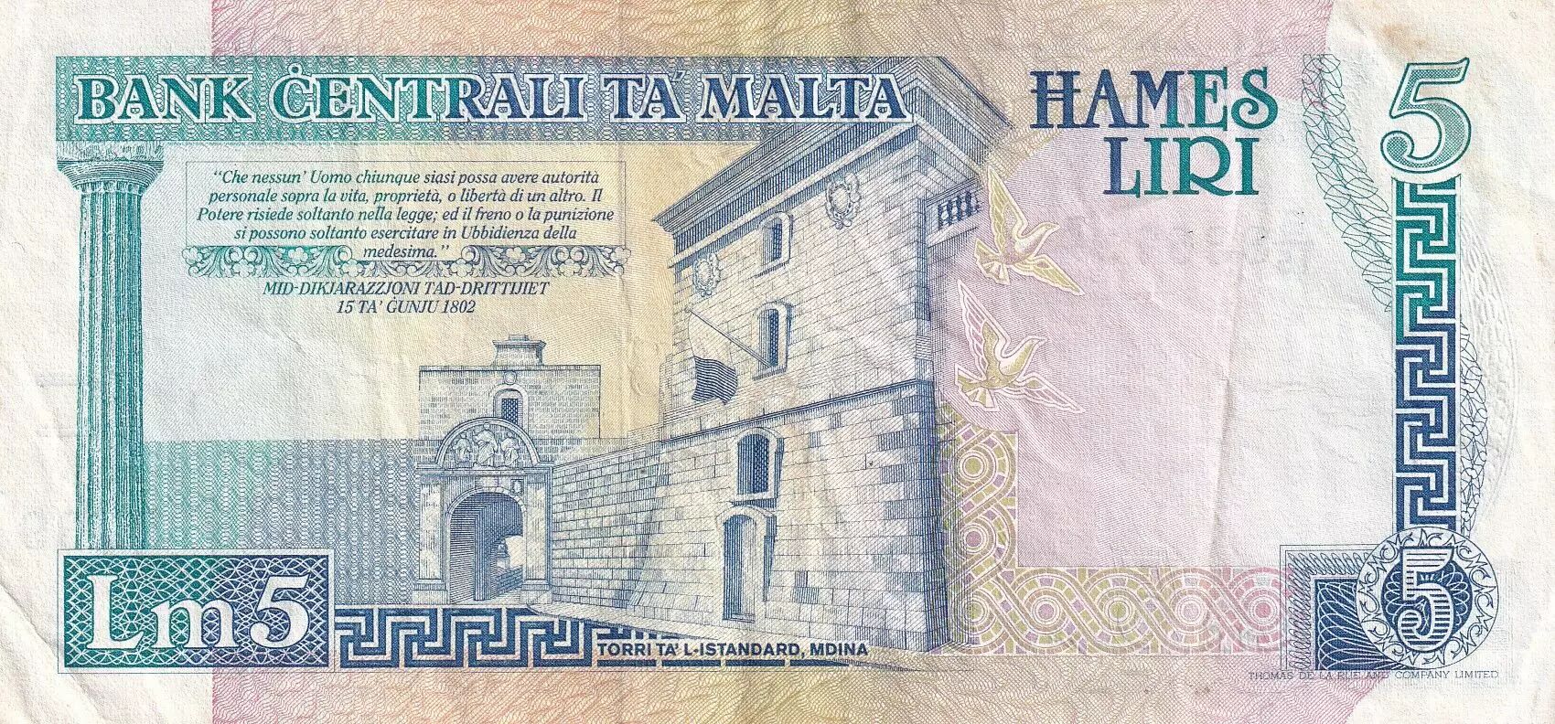 Billet Malte 5 Liri - Guerrière - Monument - ND (1994) - Série B.15 - P.46a