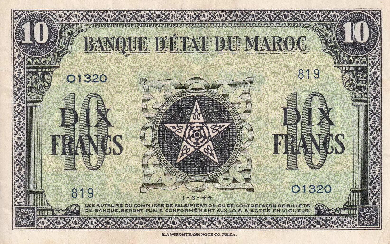 Billet Maroc 10 Francs - 01-03-1944 - SUP - Série O.1320 - P.25