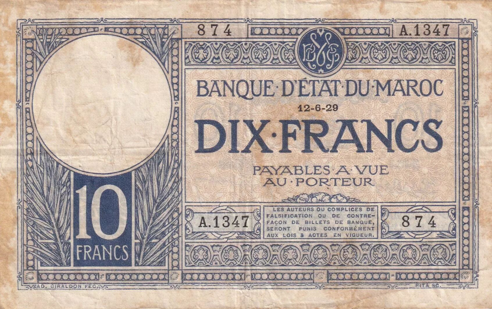 Accueil > Archivage > Maroc 10 Francs - 12-06-1929 - Série A.1347