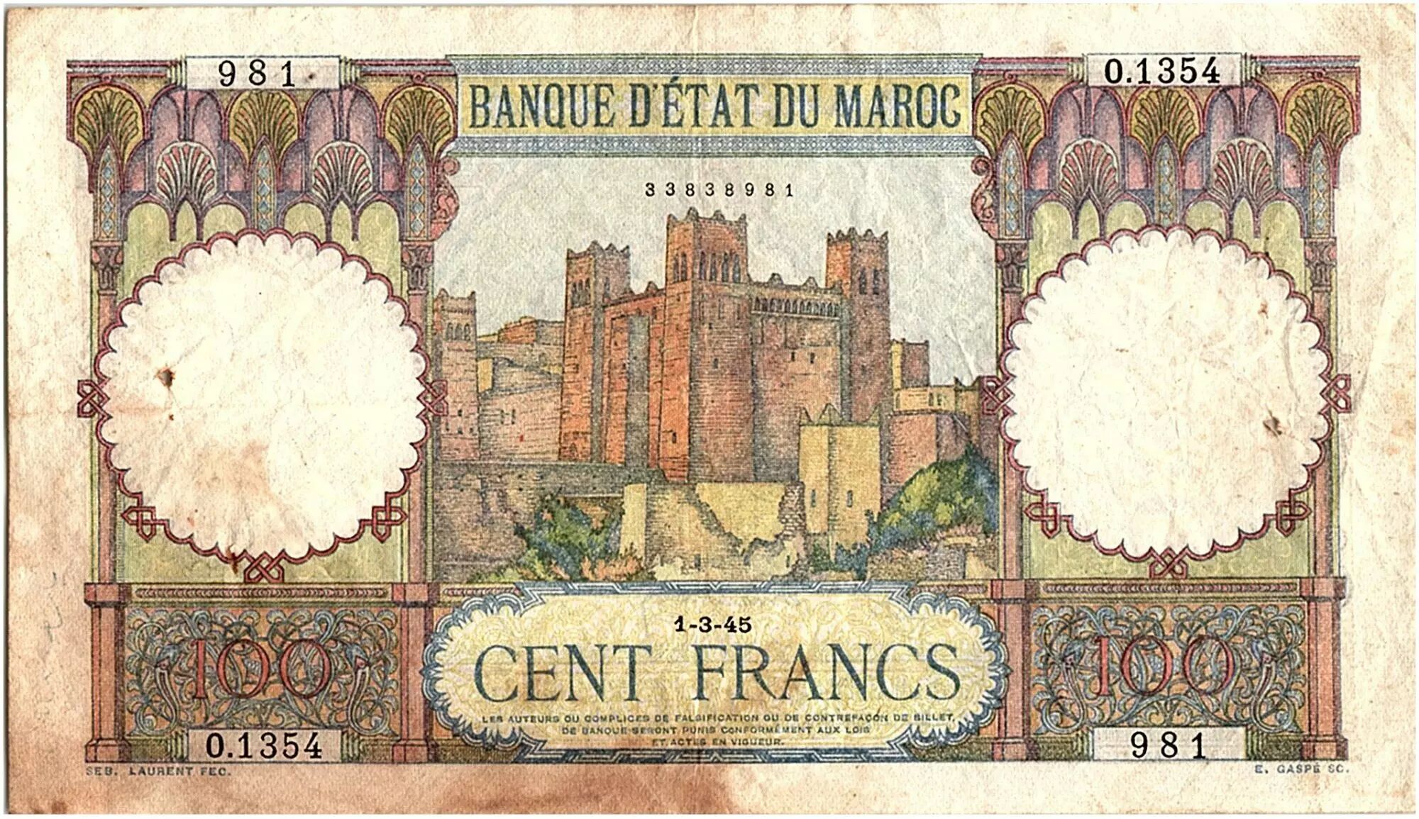 Billet Maroc 100 Francs - Ksar d'Aït-ben-haddou - 01-03-1945 - TTB - Série O.1354 - P.20