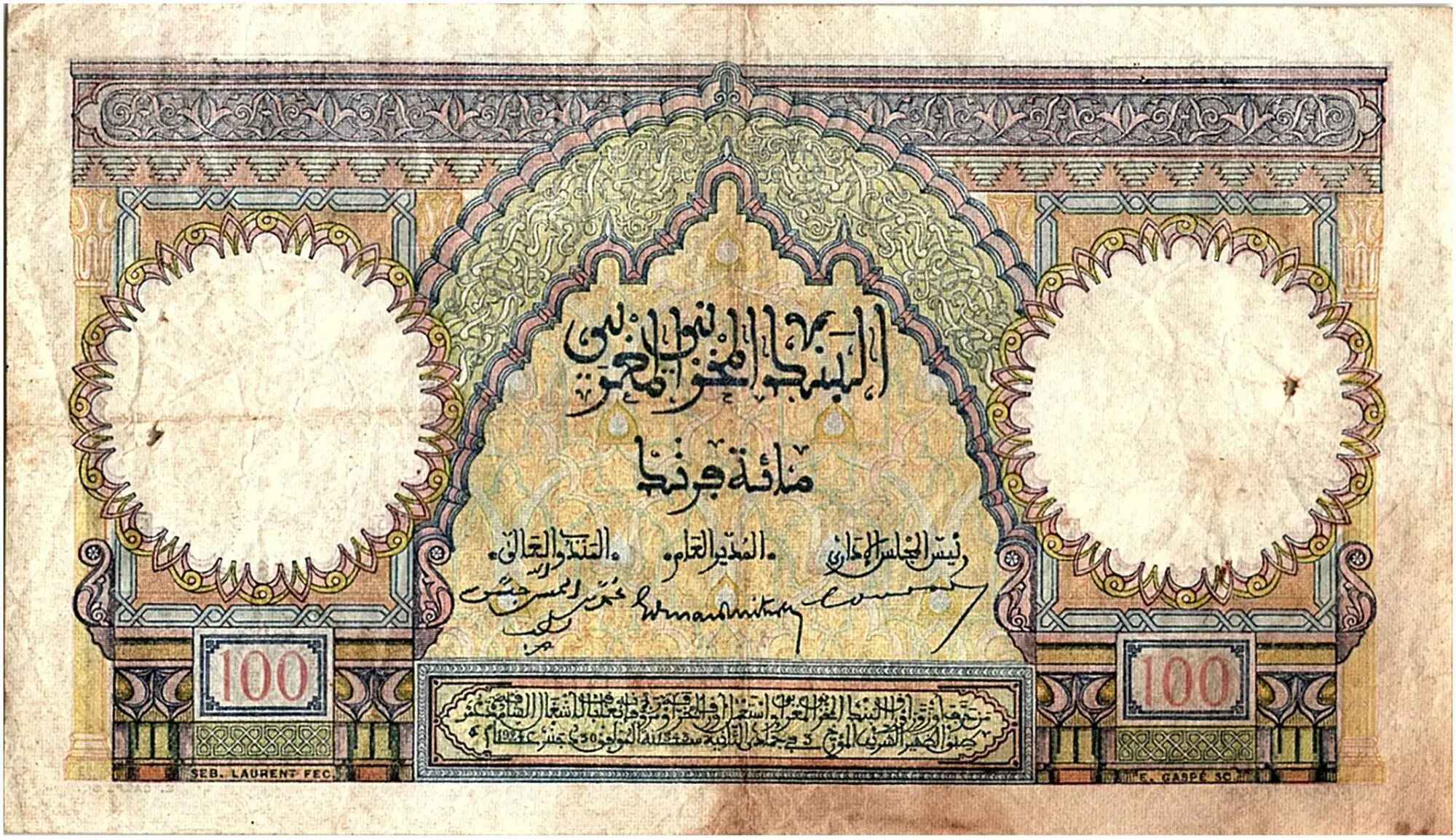 Accueil > Archivage > Maroc 100 Francs - Ksar d'Aït-ben-haddou - 01-03-1945 - TTB - Série O.1354 - P.20