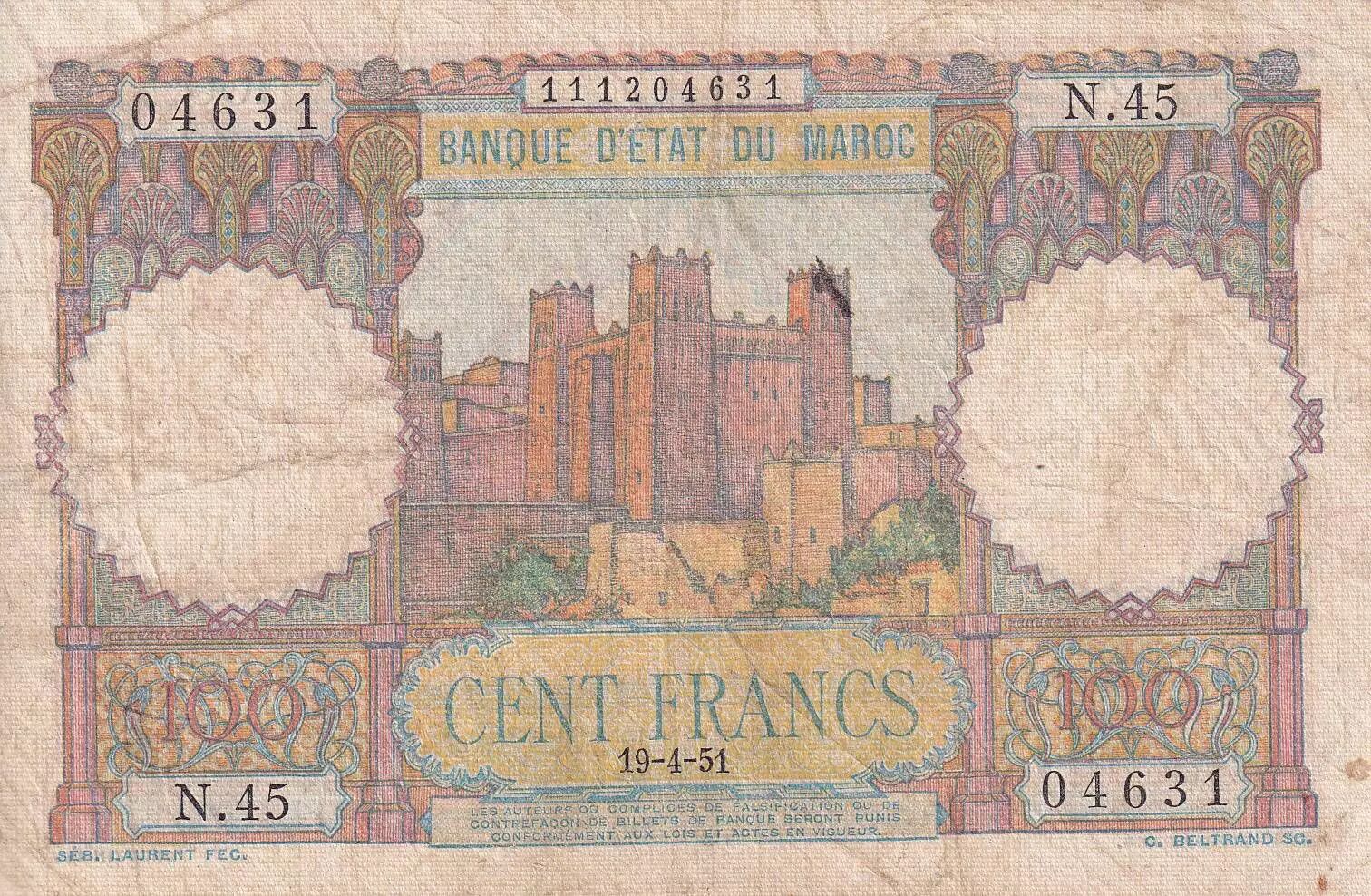 Billet Maroc 100 Francs - Ksar d'Aït-ben-haddou - 19-04-1951 - TB - Série N.45 - P.45