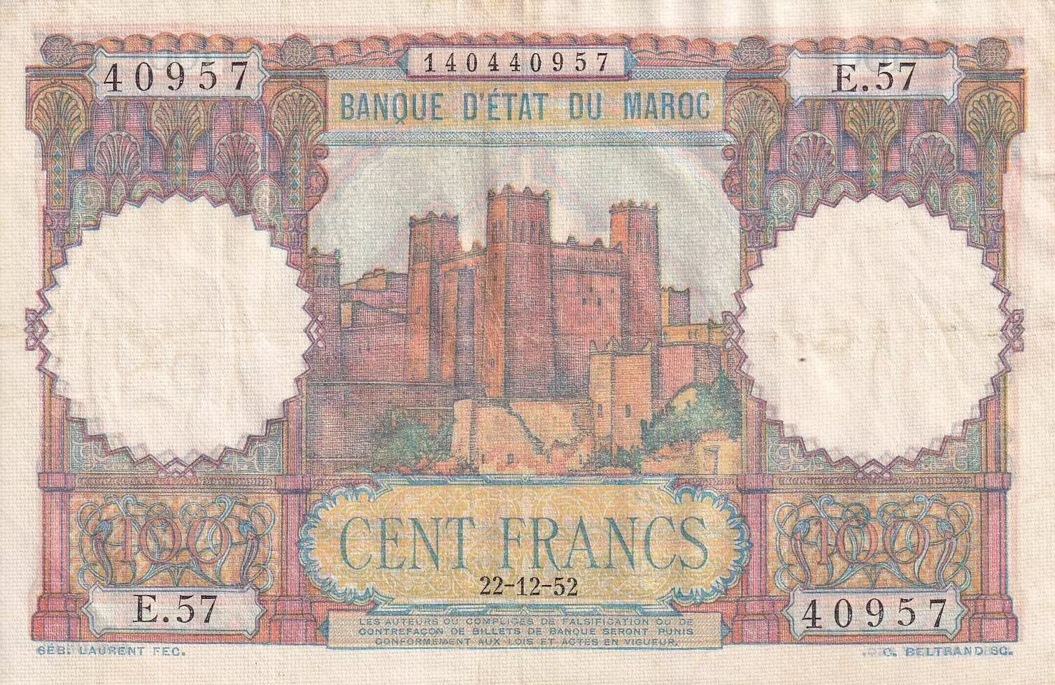 Billet Maroc 100 Francs - Ksar d'Aït-ben-haddou - 22-12-1952 - TTB - Série E.57 - P.45