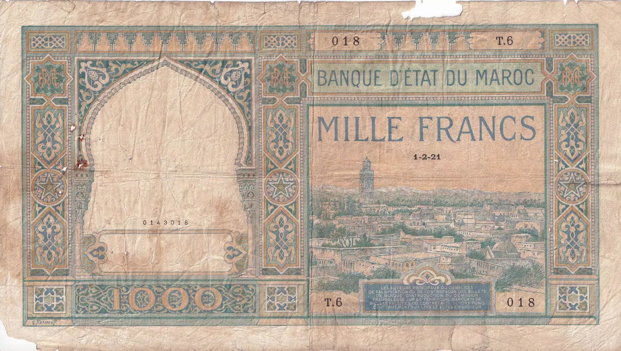 Billet Maroc 1000 Francs - Ville et Minaret - 01-02-1921- Série T.6 - AB - P.16a