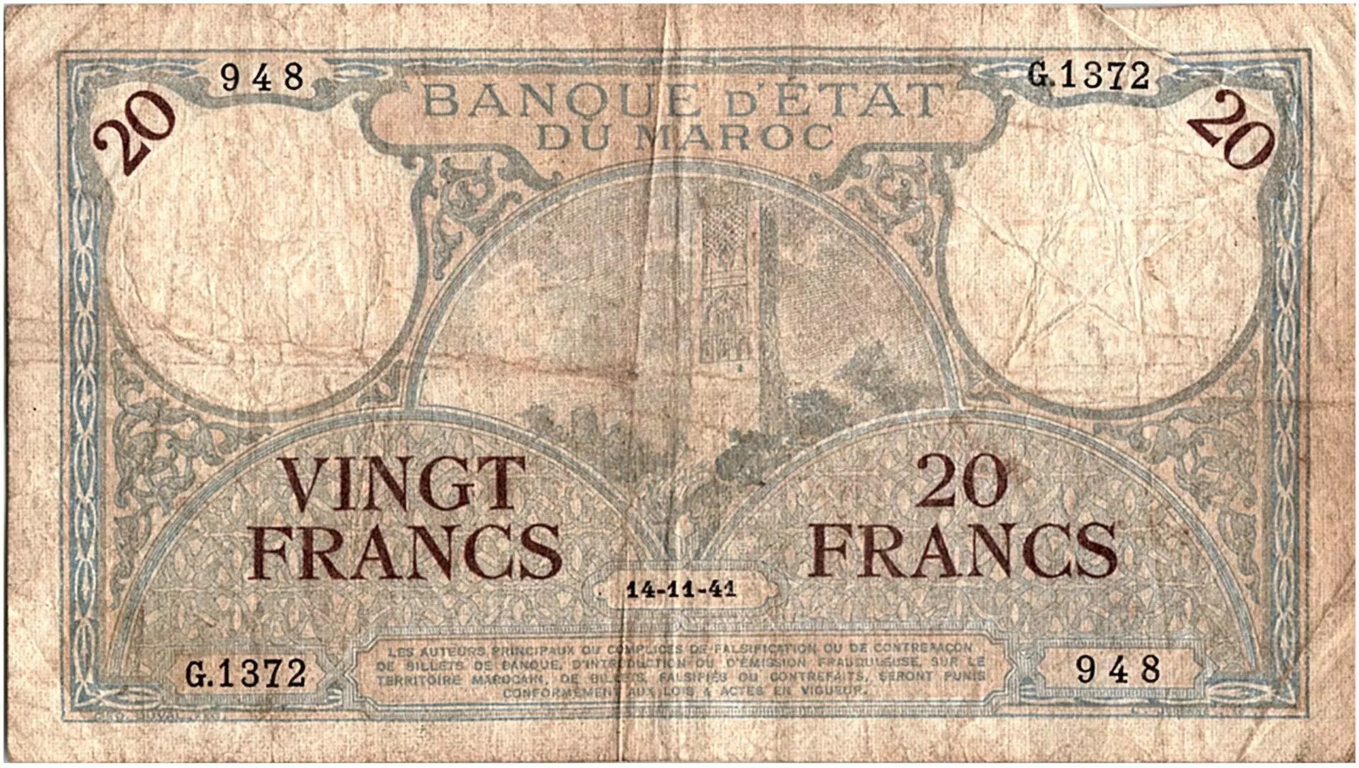 Accueil > Archivage > Maroc 20 Francs Minaret - 14-11-1941 - TB - Série G.1372- P.18b