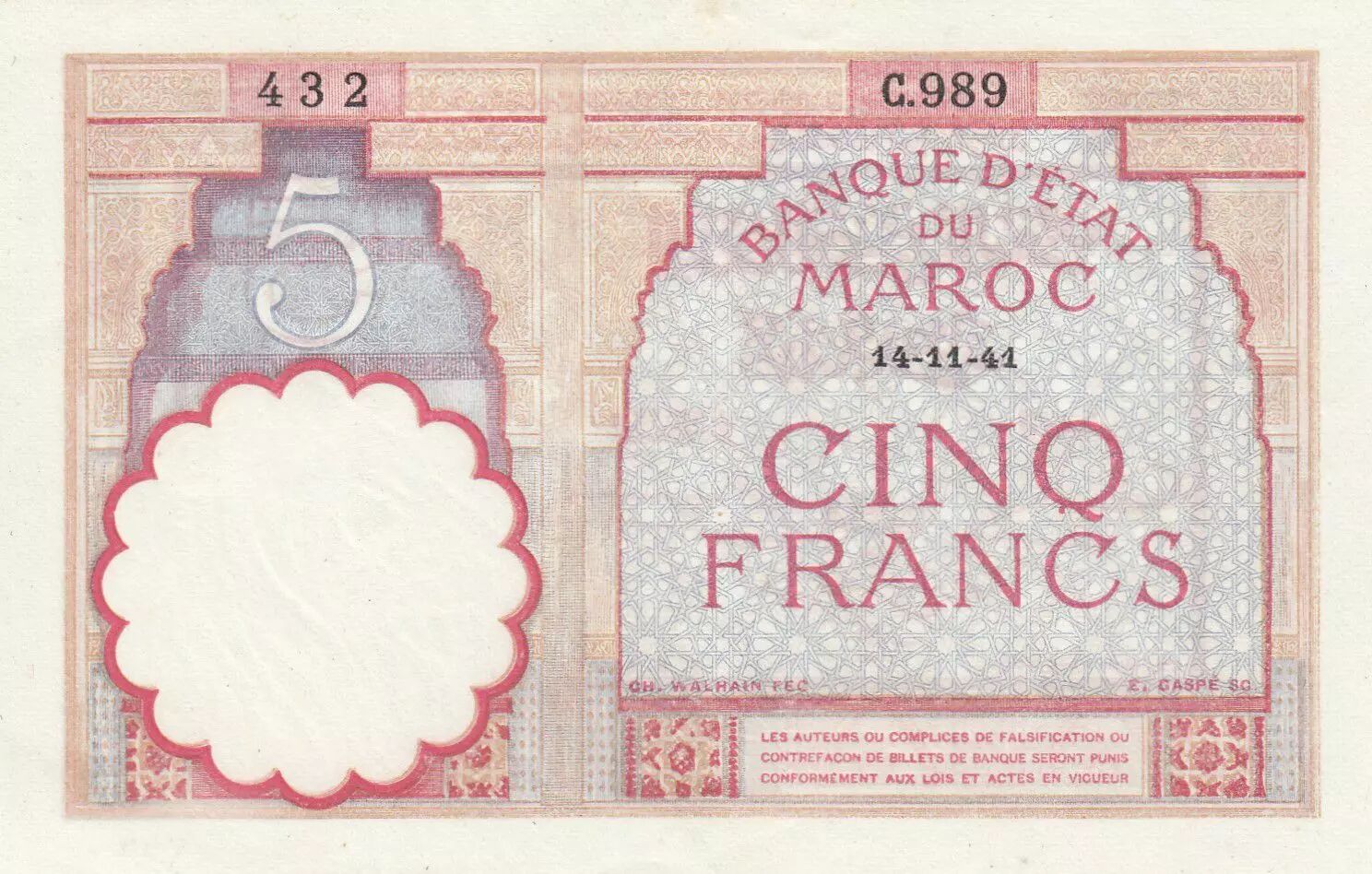 Accueil > Archivage > Maroc 5 Francs 14-11-1941 - SUP - Série C.989 - P.23Ab