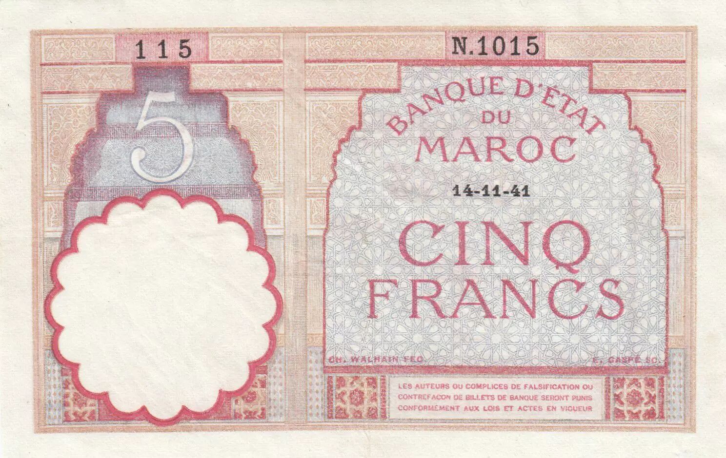 Billet Maroc 5 Francs 14-11-1941 - SUP - Série N.1015 - P.23Ab