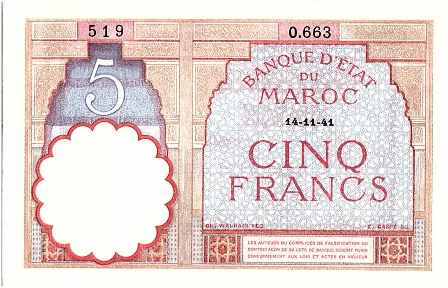 Accueil > Archivage > Maroc 5 Francs 14-11-1941 - SUP + - Série O.663 - P.23Ab