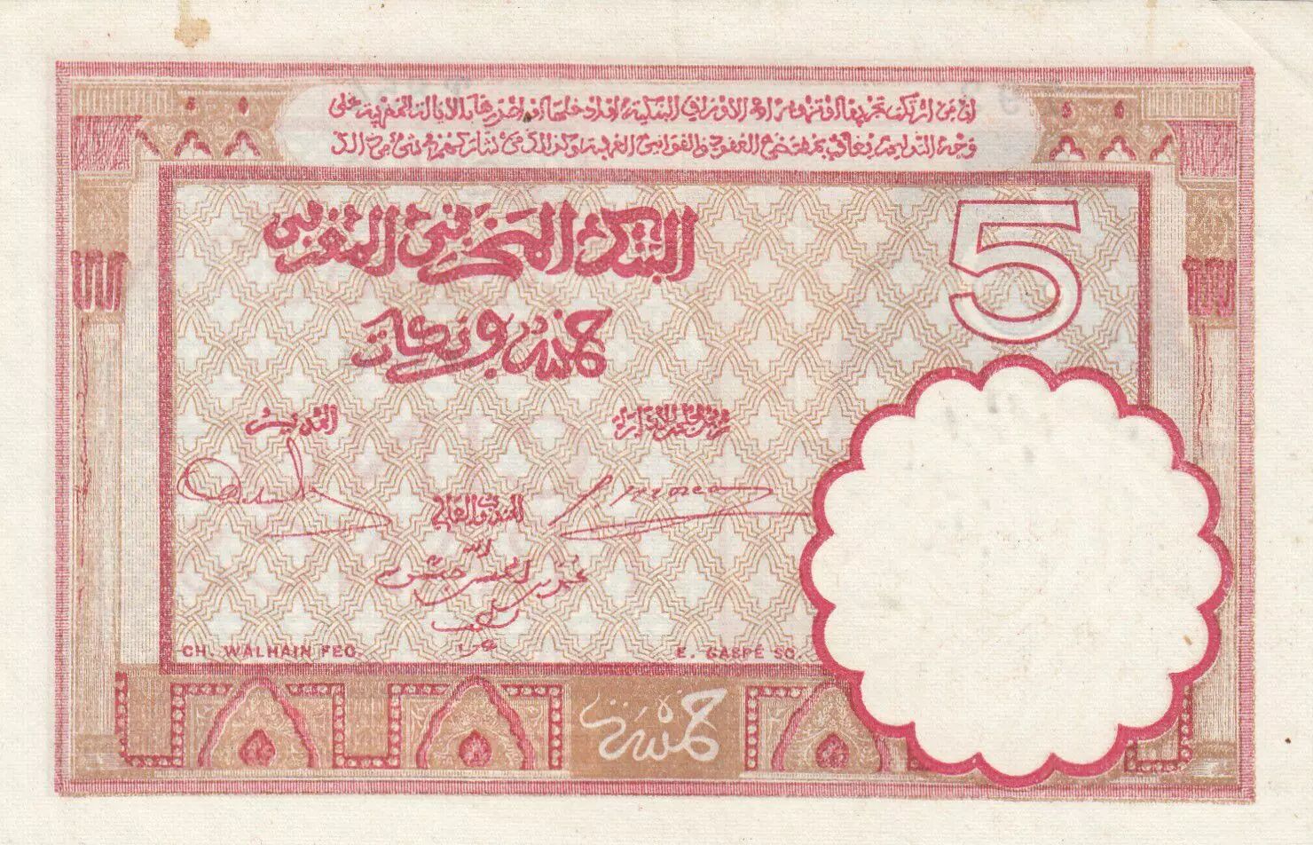 Accueil > Billets du Monde > Billets d'Afrique > Maroc > Maroc 5 Francs 14-11-1941 - SUP- Série T.854 - P.23Ab