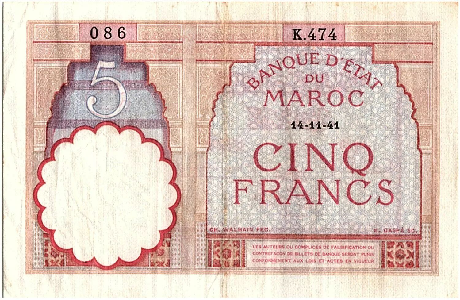 Accueil > Archivage > Maroc 5 Francs 14-11-1941 - TTB - Série K.474 - P.23Ab