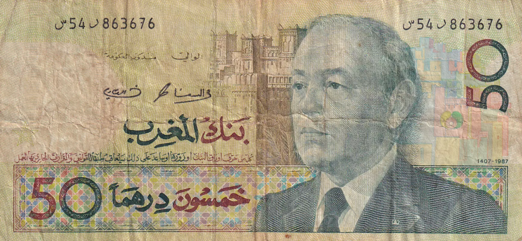 Accueil > Archivage > archivage-Billets du Monde > Maroc 50 Dirhams - Hassan II - Charge militaire à cheval - 1987 - P.64b
