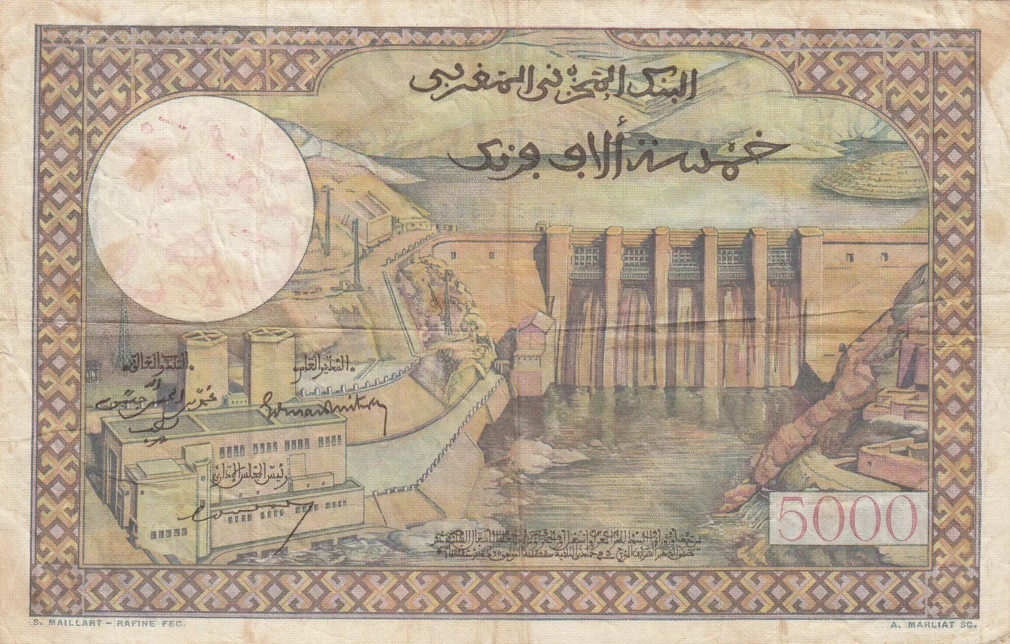 Accueil > Archivage > Maroc 50 Dirhams sur 5000 Francs surchargé 02-04-1953 - Série V.425 - TTB - P.51