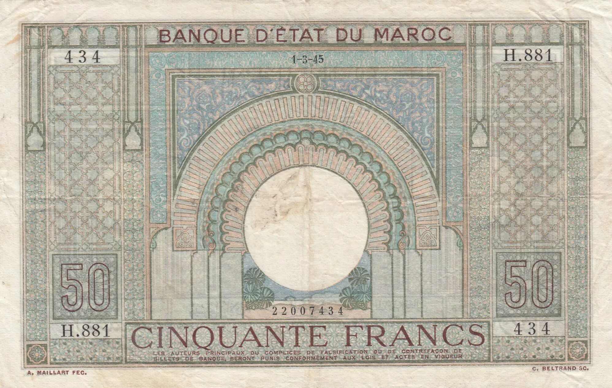 Billet Maroc 50 Francs 01-03-1945 - Grand Format - - TTB - Série H.881 - P.21