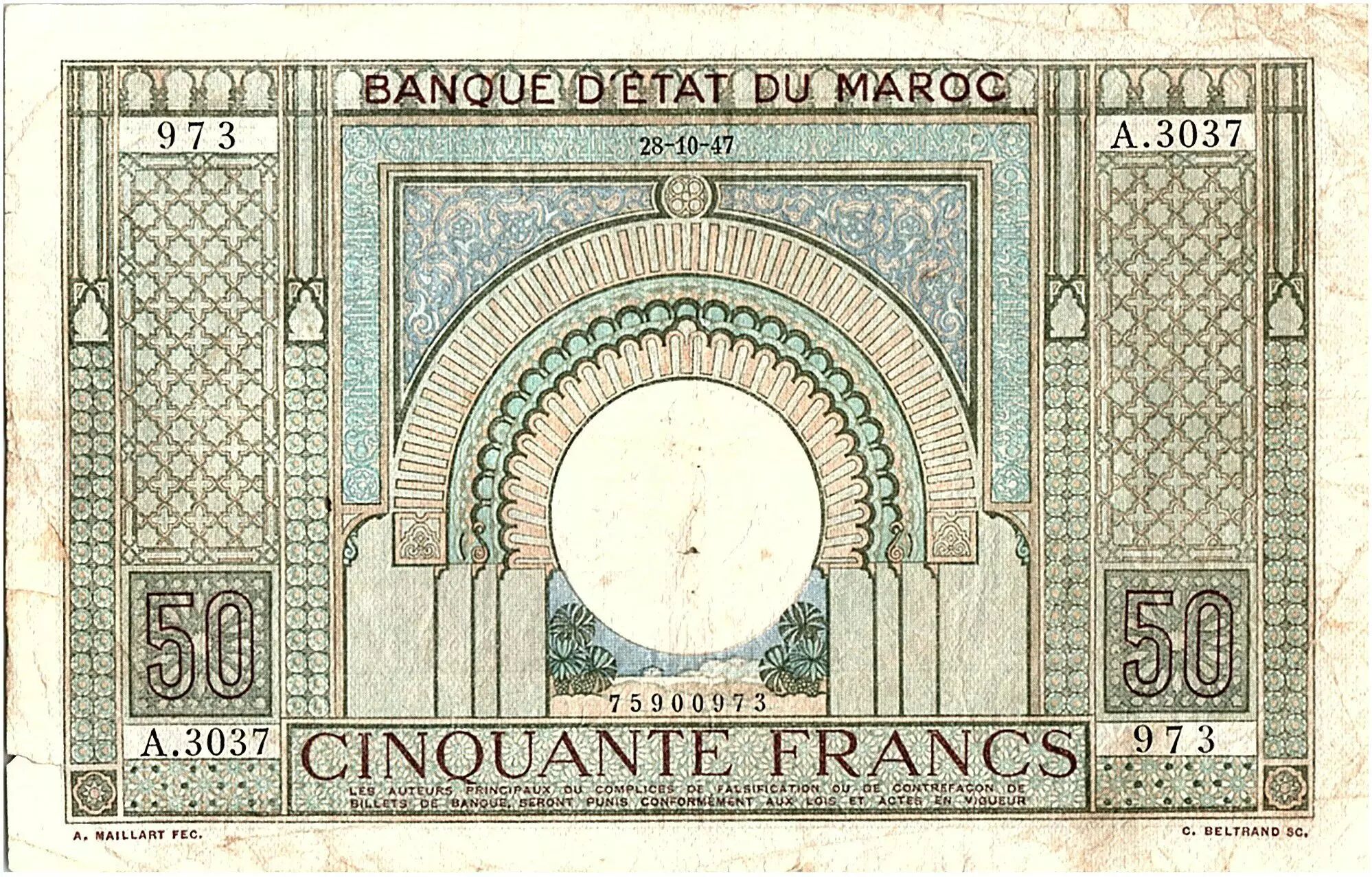Accueil > Archivage > Maroc 50 Francs 28-10-1947 TB- Série A.3037 - P.21