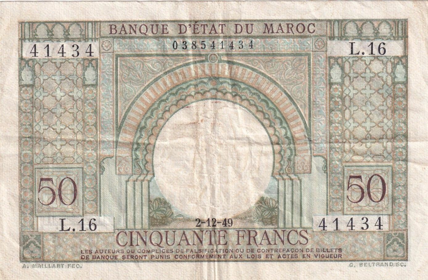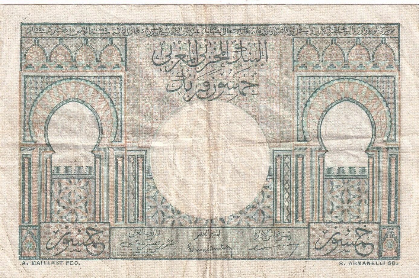 Ce billet de banque, d'une valeur nominale de 50 francs, a été émis par le Maroc en 1949. Ses dimensions sont de 120 mm de longueur et 78 mm de largeur. Le poids de ce billet est d'un gramme.