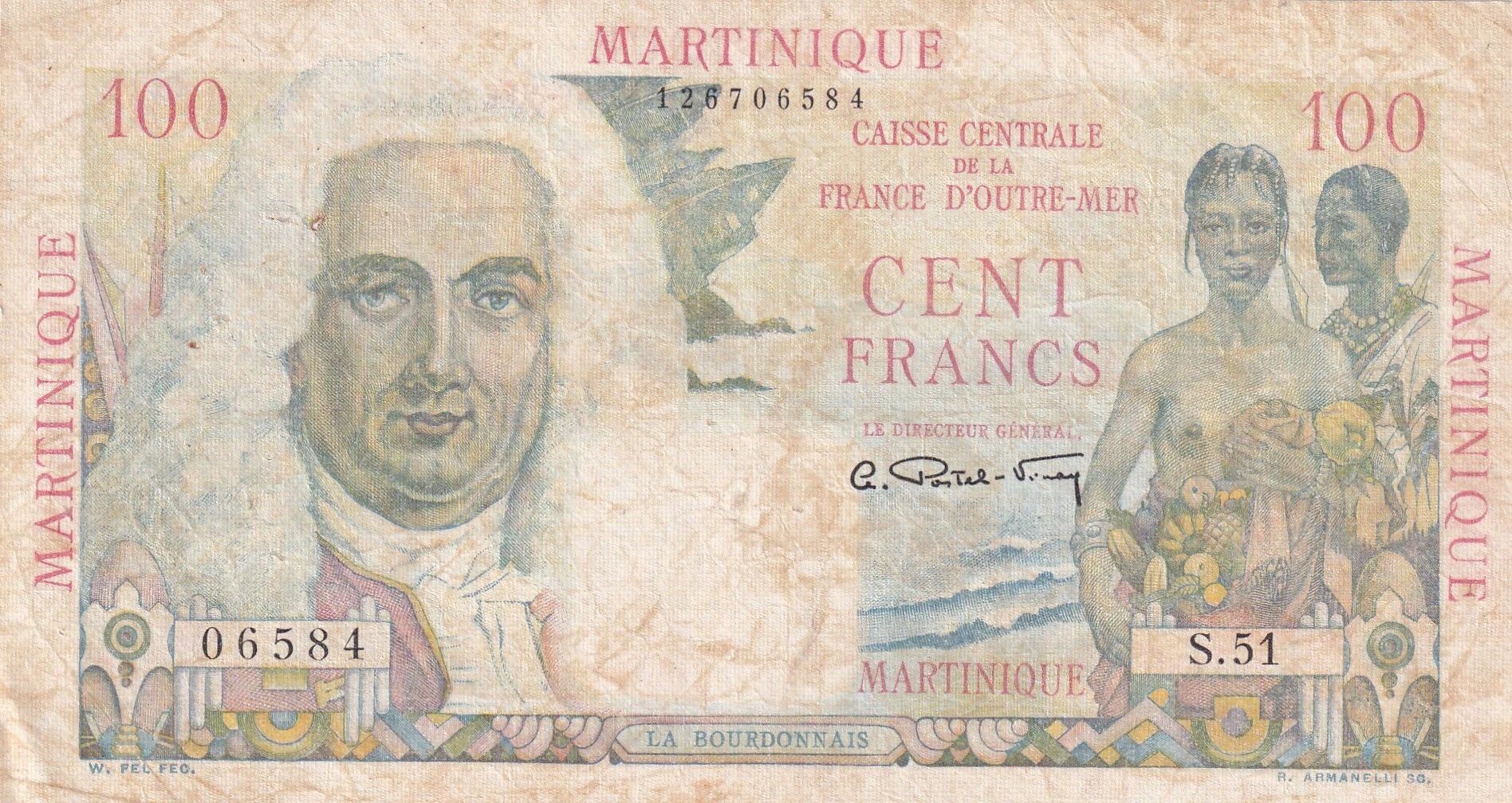 On the front, the banknote depicts Bertrand-François Mahé, Count of La Bourdonnais, as well as a couple. The inscriptions "MARTINIQUE", "CAISSE CENTRALE DE LA FRANCE D'OUTRE-MER", "CENT FRANCS" appear clearly, accompanied by the serial number "117353246" and the mention of the Director General. You can also read "LA BOURDONNAIS" as well as the artists' signatures: "W. FEL. FEC." and "R. ARMANELLI SC.". The writing used is Latin.